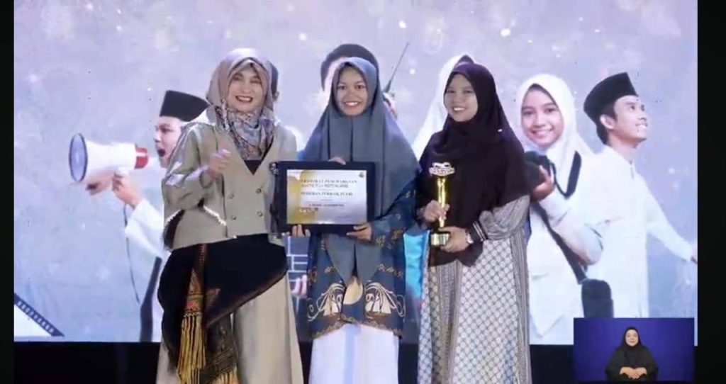Hj. Sitti Shalehah, S.Pd. yang langsung menerima pengahragaan tersebut yang didampingi oleh 4 orang santri putri  yang juga dihadiri oleh Anggota Konsorsium Dr. Muhammad Ali Bakri.